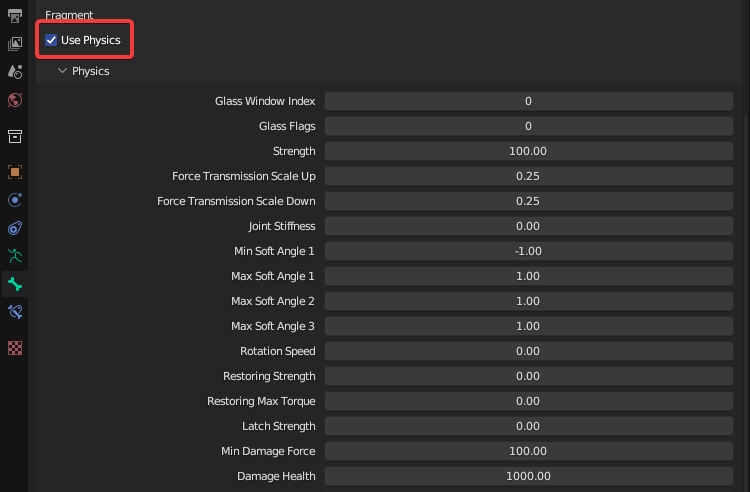 Most importantly, enabling Use Physics is what causes the bone to react to physics. If this is unticked, any geometry associated with the bone will always remain static in-game. Usually, you'd have a bone for each separable part. That way, all parts of your Fragment will act independently of each other. See the Prop Setup page for an example (vehicles also have separable parts but the bone hierarchy is usually much more complex).