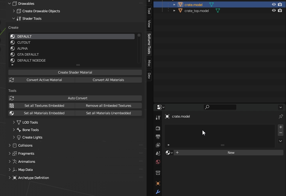 Game meshes are stored in the Drawable (.ydr) file format. Creating Drawables in Sollumz is very simple. This tutorial will walk you through step-by-step.
