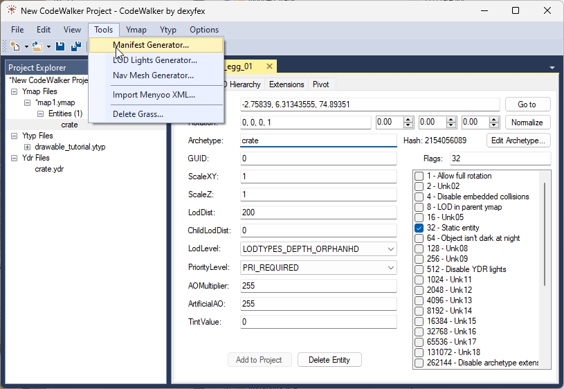 Before exporting I'm going to rename my Drawable to something more descriptive like "crate". Once you're happy with everything, export the Drawable by clicking File > Export > Codewalker XML. I am going to also enable Export with ytyp. This will automatically generate a YTYP with the Drawable we created already defined.
