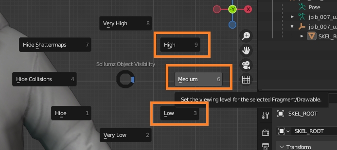 The easiest way to switch between LODs quickly is to press SHIFT + V (make sure you are no longer in edit mode) to bring up the Sollumz Object Visibility wheel.