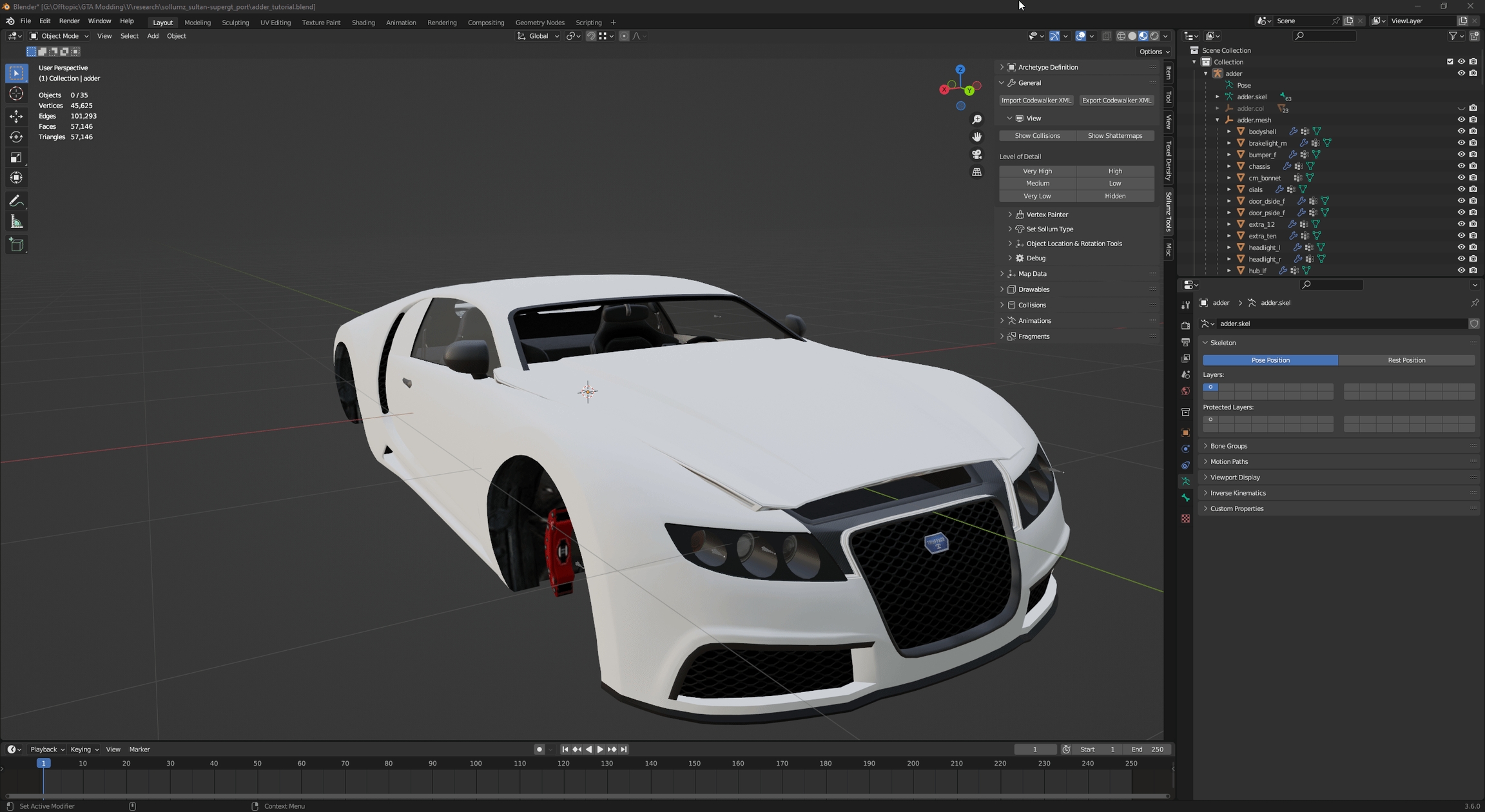 Our new custom bonnet model has to be considered by Sollumz as a valid part, so we have to move the mesh by expanding Adder's armature then drag and drop bonnet's Drawable Model inside adder.mesh