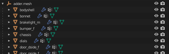 Notice how each object represents a separable part of the vehicle. Since it's split by vertex group, each object will only have one vertex group.