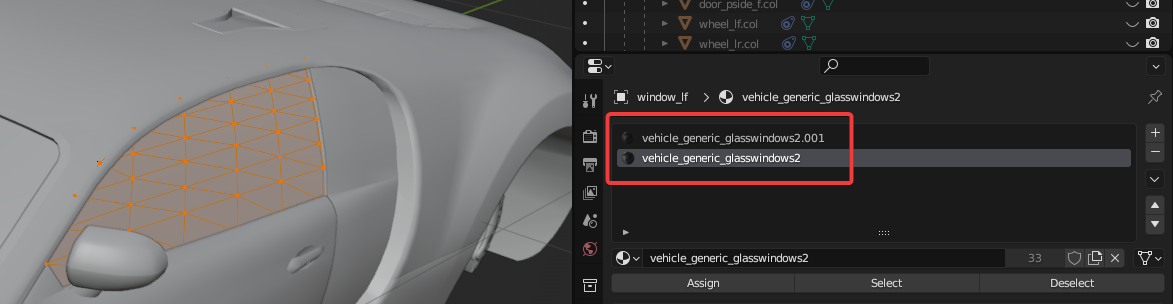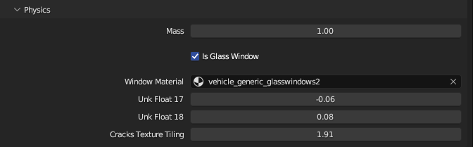 Enabling Is Glass Window will cause the window properties to appear. The only property you should have to change here is the Window Material. This is the material that the corresponding window mesh uses. Looking at the window_lf mesh materials, we see that it uses two vehicle_generic_glasswindows2 materials.