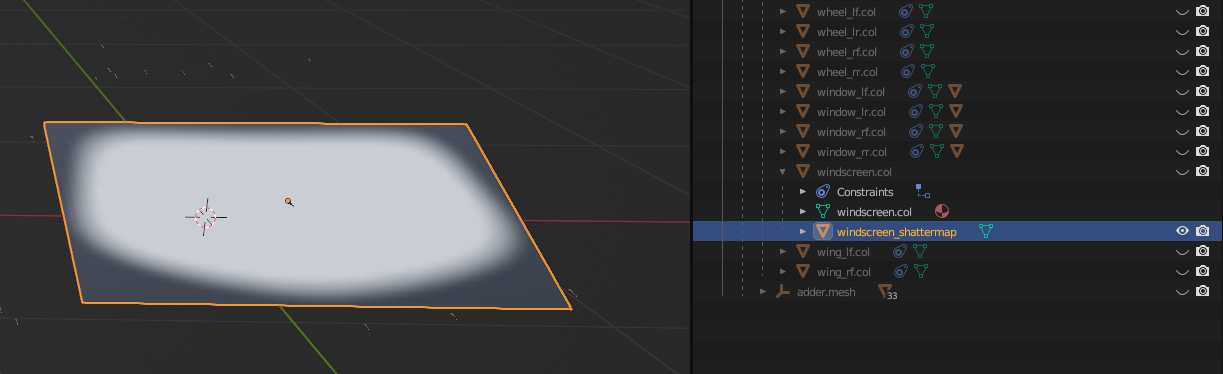 In Sollumz, shattermaps are represented as planes with a single texture. For example, adder.yft has an object called windscreen_shattermap which is parented to windscreen.col.