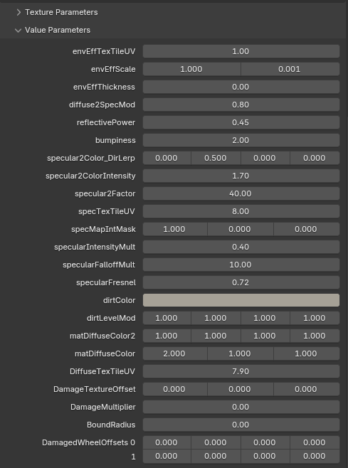 <table><thead><tr><th width="320">UV Maps</th><th width="379">Texture</th></tr></thead><tbody><tr><td>UVMap 0</td><td>Dirt normal map</td></tr><tr><td>UVMap 1 </td><td>Livery</td></tr><tr><td>UVMap 2</td><td>Dirt / Diffuse tileable UV (edited in DiffuseTexTileUV) / Snow sampler tileable UV (edited in envEffTexTileUV) / Specular</td></tr></tbody></table>