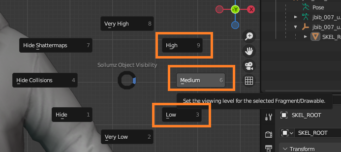 The easiest way to switch between LODs quickly is to press **SHIFT + V** (make sure you are no longer in edit mode) to bring up the Sollumz Object Visibility wheel.