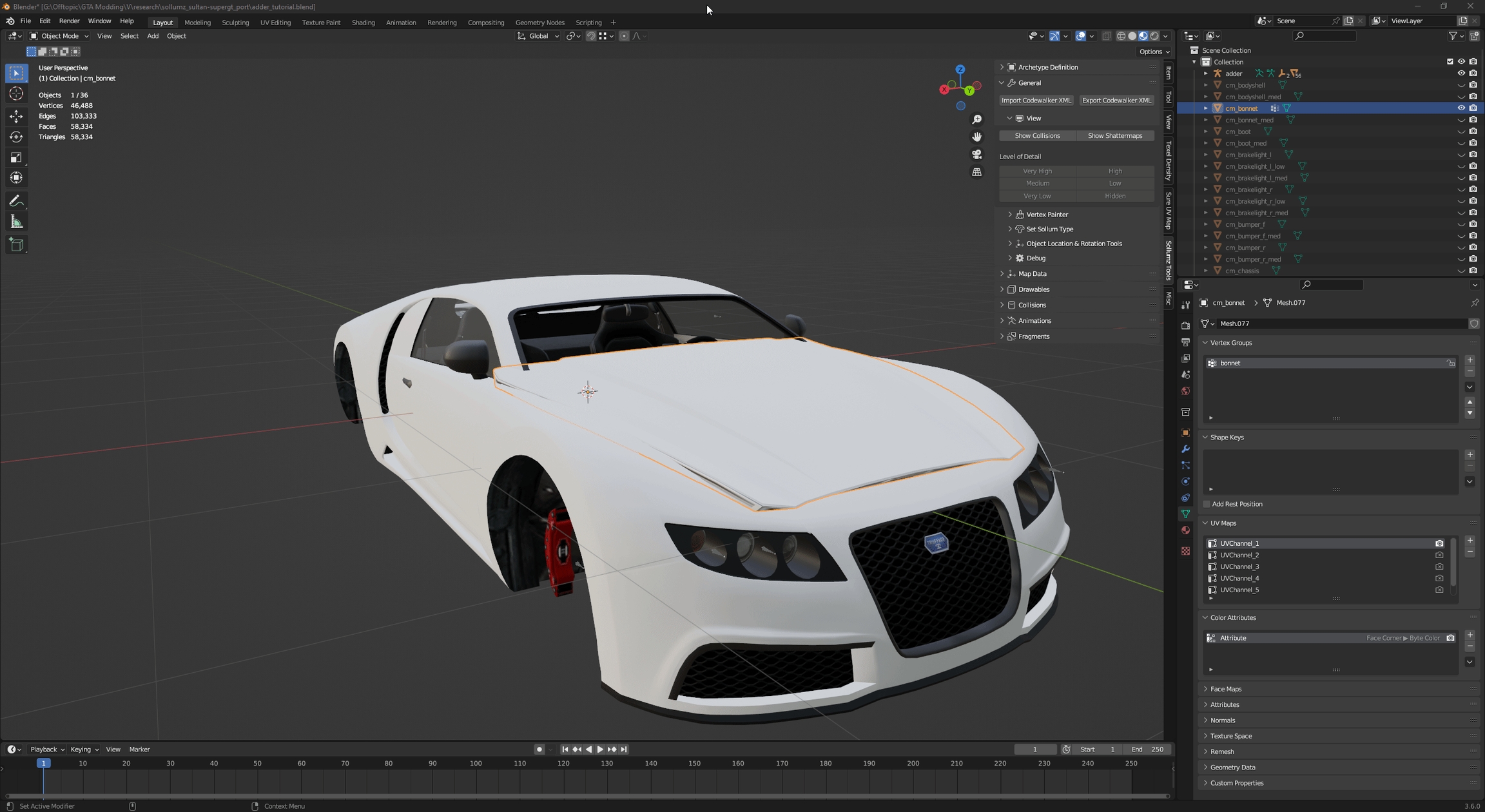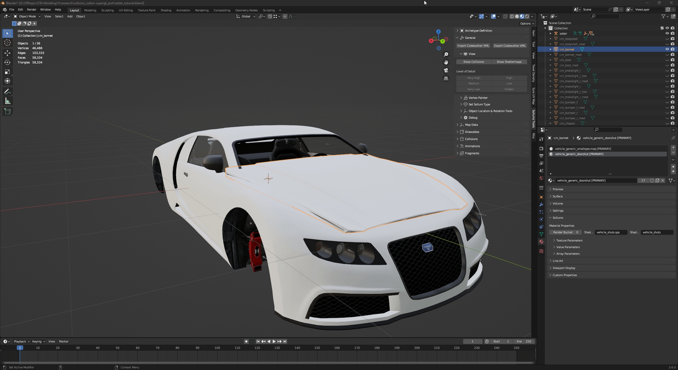 Our new custom bonnet model has to be considered by Sollumz as a valid part, so we have to move the mesh by expanding Adder's armature then drag and drop bonnet's Drawable Model inside adder.mesh