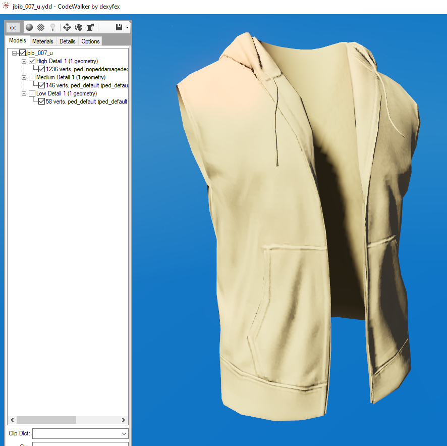 You might have already noticed, but there's one texture we don't have yet: A diffuse texture. The diffuse texture for clothing YDDs stays un-embedded from the model and in a separate file called a  YTD (texture dictionary), and you can have up to 26 of them (A to Z) for any single YDD. We *don't  need* the texture for our editing today, but it's nice to have a visual reference, so let's grab one now.