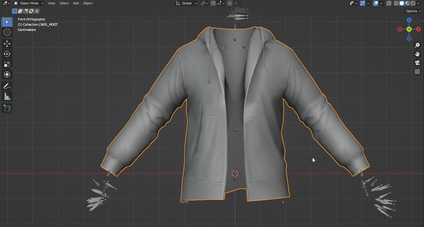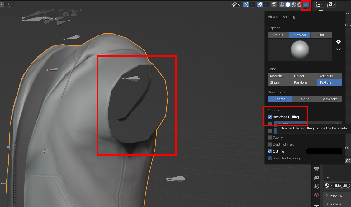 The reason we want to fill in the holes is because GTA uses back-face culling. What this means is that the faces on the model do not have both a viewable "front" and "back". Instead, the front-facing side is visible and the back is invisible. We can see this in action in blender by going back up to the viewport shading options and turning it on.