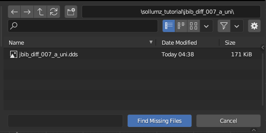 Navigate to your project folder and select the **jbib\_diff\_007\_a\_uni** sub-folder where you will see the **jbib\_diff\_007\_a\_uni.dds**. Then press 'find missing files'.&#x20;
