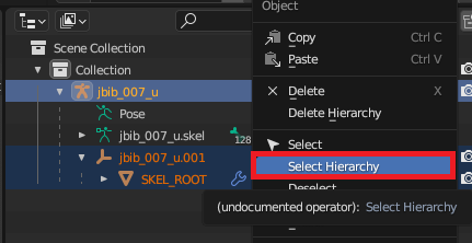 * In the outliner window, right-click **jbib\_007\_u** and `select hierarchy`