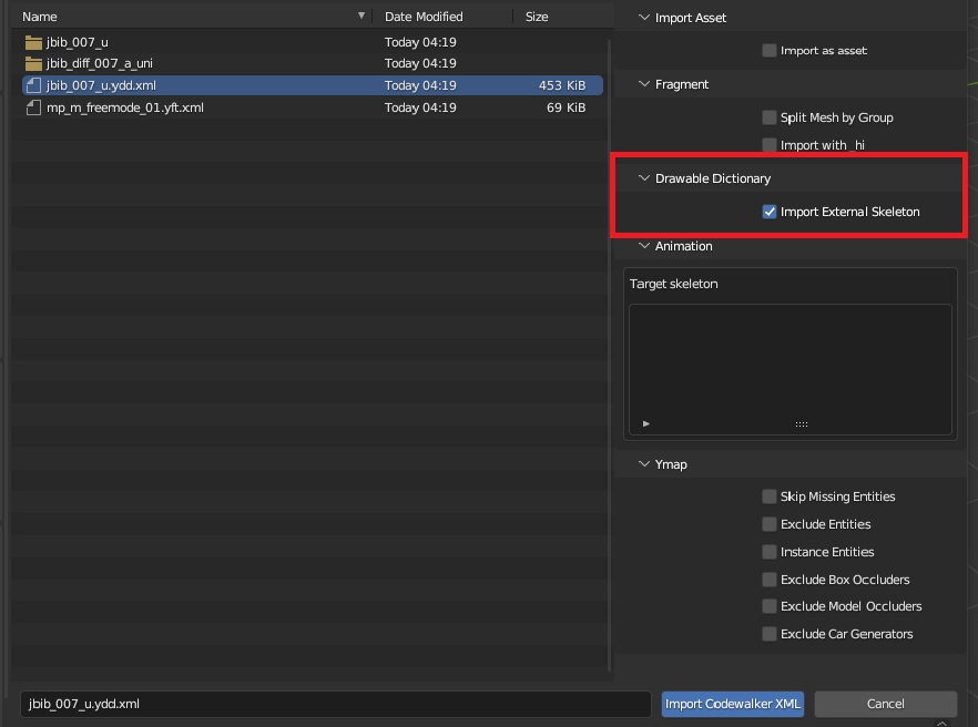 Click jbib_007_u.ydd.xml and from the side-menu options make sure you select 'Import External Skeleton'