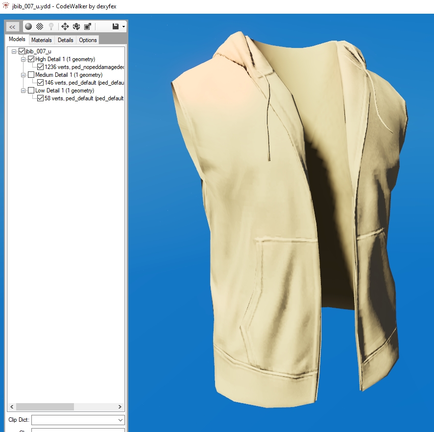 You might have already noticed, but there's one texture we don't have yet: A diffuse texture. The diffuse texture for clothing YDDs stays un-embedded from the model and in a separate file called a YTD (texture dictionary), and you can have up to 26 of them (A to Z) for any single YDD. We don't need the texture for our editing today, but it's nice to have a visual reference, so let's grab one now.