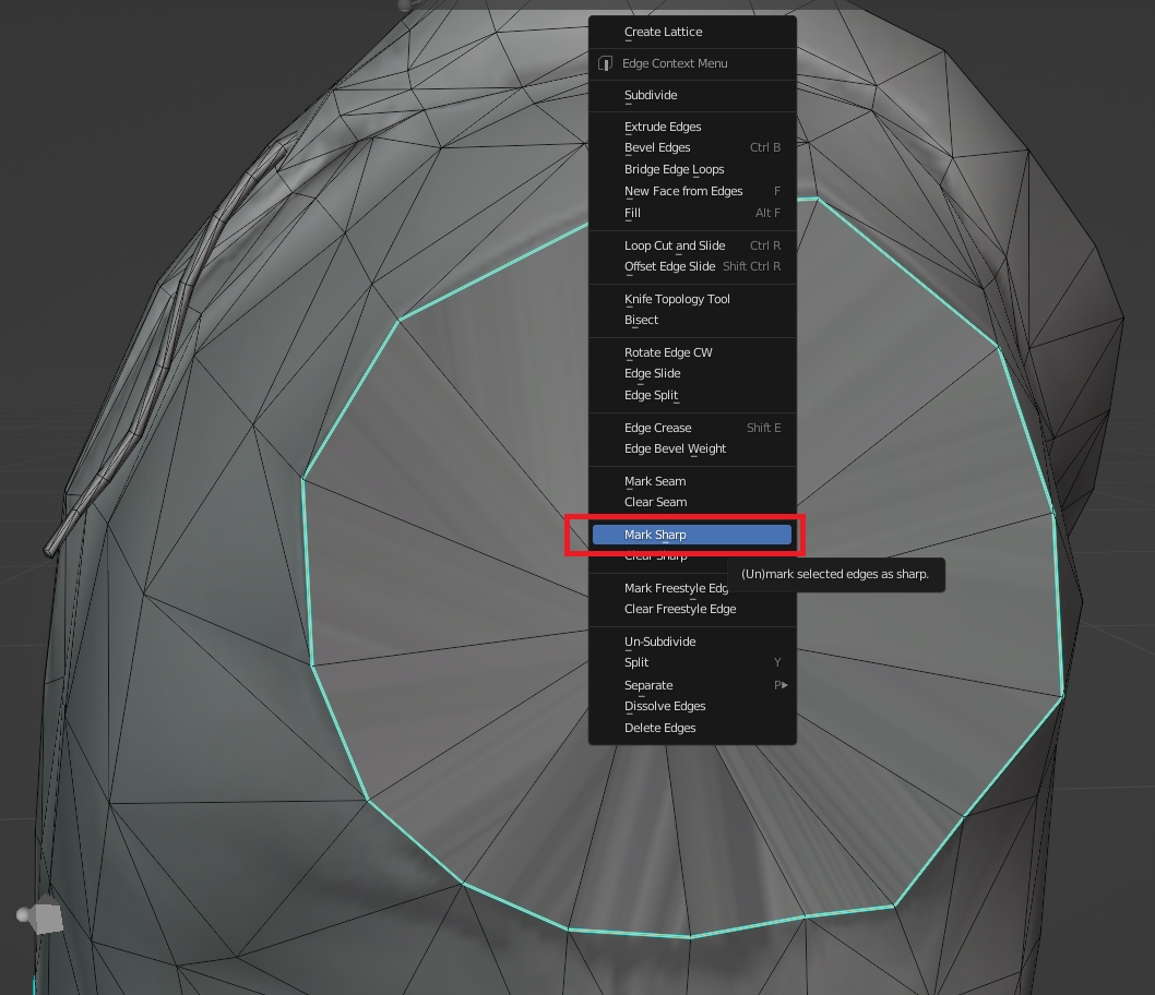 For now I'll go to edge select & select the loop I filled in, then right-click and press "mark sharp"