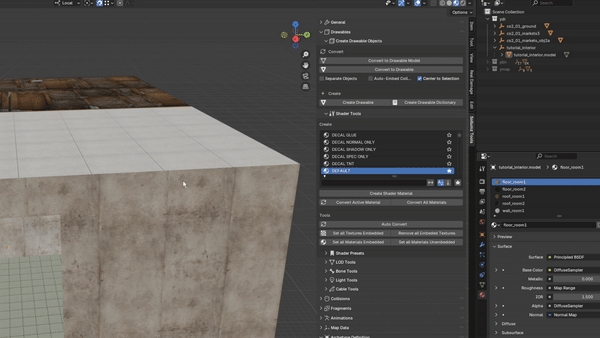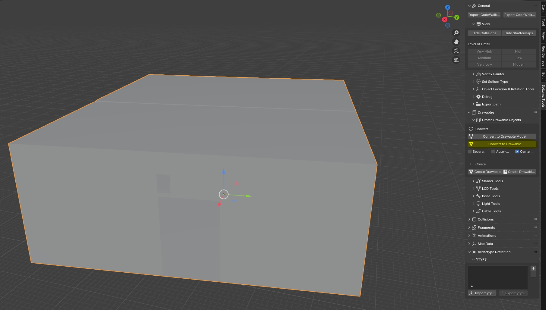 Next, we need to add materials to the Drawable Models. With one of the Drawable Models selected, open the Sollumz Tools > Drawable > Shader Tools