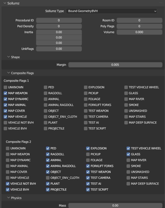 There is also a tool for automatically calculating mass based on the collision material's density and the object's volume. Navigate to Sollumz Tools > Fragment > Set Mass. There you will find the Calculate Collision Mass tool.